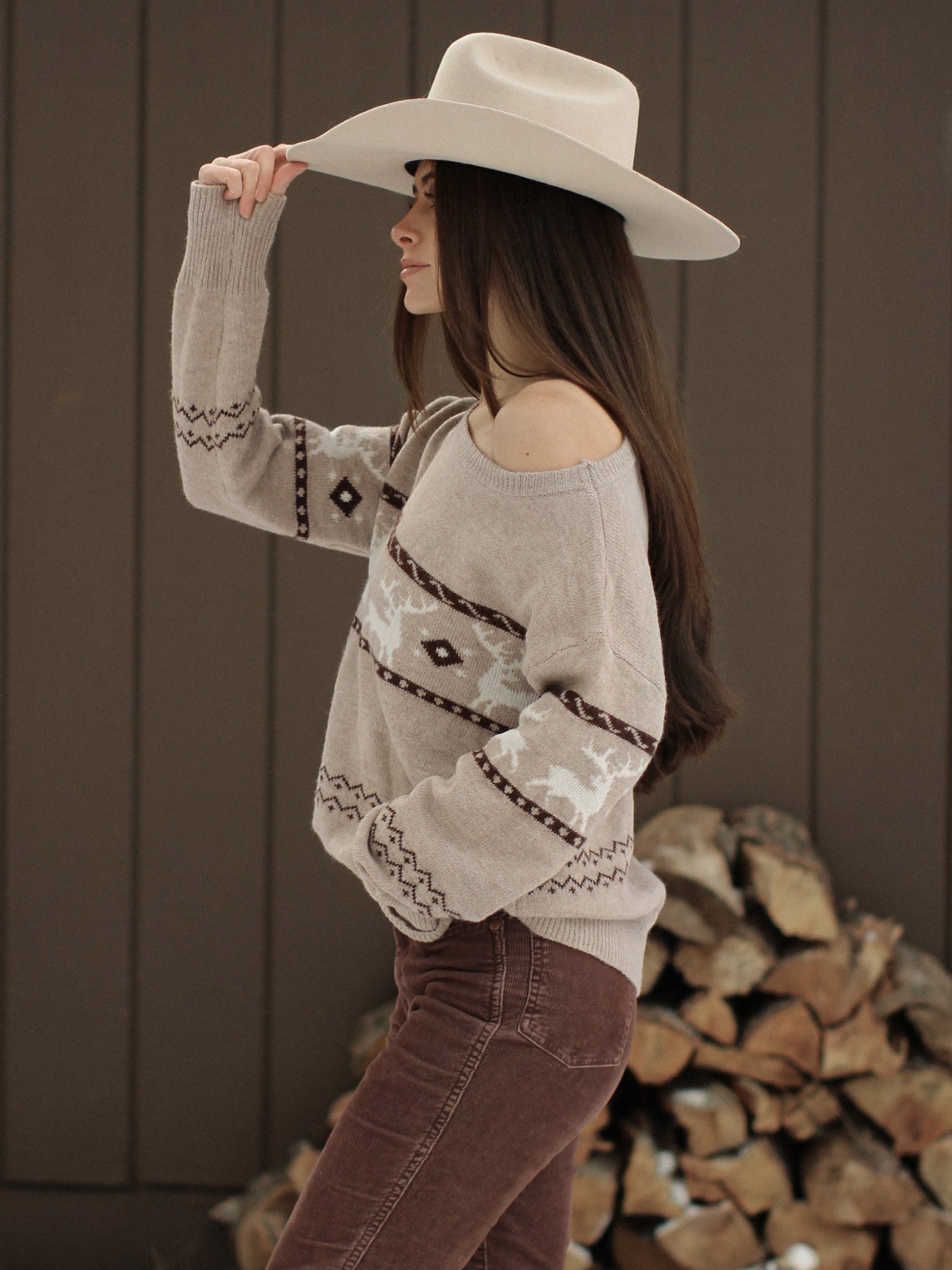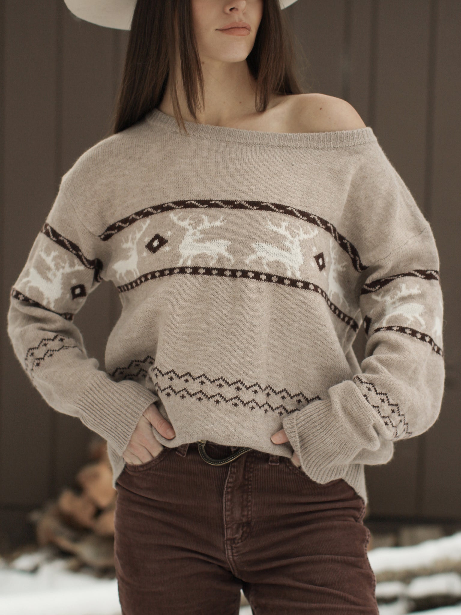 Stay cozy this holiday season with our Reindeer Off The Shoulder Sweater. Made for festive occasions, this slouchy sweater features a slouchy design with a cute reindeer pattern. Perfect for fireside gatherings, making it the coziest addition to your winter wardrobe.